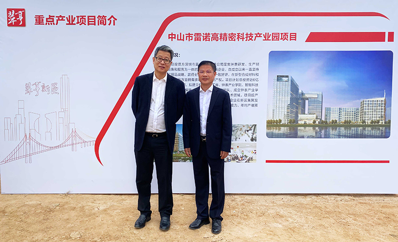 (廣東雷諾精密科技有限公司董事長(zhǎng)詹西洲與翠亨新區(qū)管理委員會(huì)副主任許行合影留念)