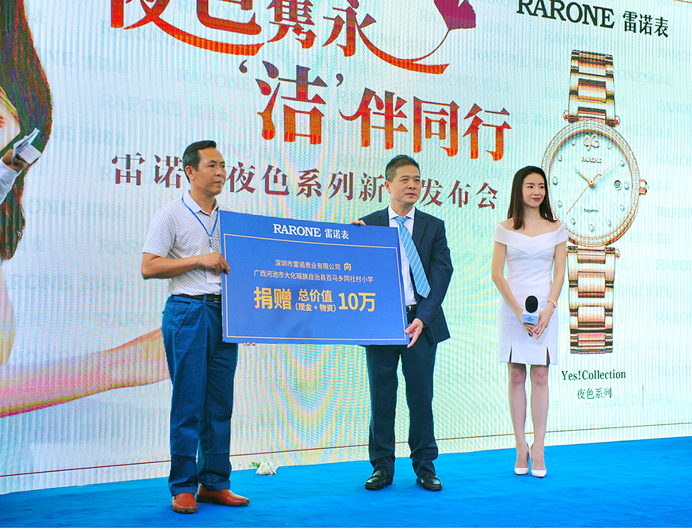 女神表示自己也非常喜歡這款新品傳達的永恒主題,表款的設(shè)計也很有意思,會是當下都市女性青睞的腕間配飾。值得一提的是,一直熱心公益事業(yè)的雷諾表,在本次發(fā)布會上邀請董潔一同見證品牌方為廣西河池市大化瑤族自治縣百馬鄉(xiāng)同社村小學(xué)開展的愛心助學(xué)捐贈,在當?shù)孛襟w以及明星董潔的見證下,雷諾表為貧困小學(xué)捐贈10萬愛心物資及義款,用有溫度的時間將一顆顆愛心傳遞,溫暖每一個需要幫助的孩子。