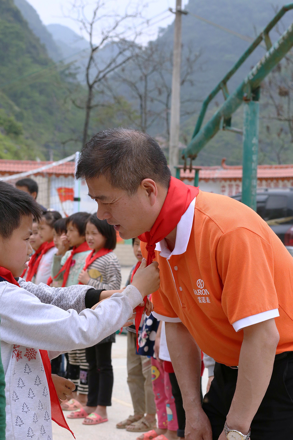 雷諾表愛心小組在總經理詹江洲先生的帶領下,從南寧市區出發,一路上綠水青山風景秀美,但在快要到達同社村的山路上,我們真正見識了九曲十八彎的大山路。經過3個多小時的長途跋涉,我們的愛心車輛終于抵達同社村小學,遠遠就看到學校的孩子在校門口等待我們,當孩子們親手為我們系上鮮艷的紅領巾,雷諾表愛心小組的每個成員的使命感愈加強烈。