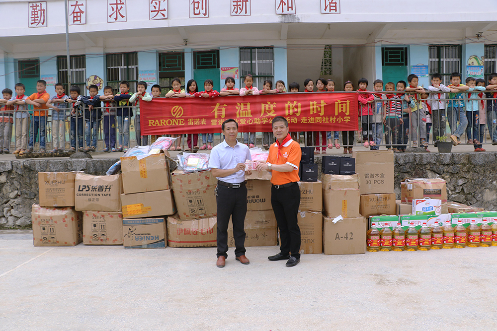 雷諾表夜色系列新品發布會剛剛落幕,在女神董潔和南寧眾多粉絲的見證下,雷諾表向廣西河池市大化瑤族自治縣百馬鄉同社村小學捐贈10萬愛心物資及義款。5月2日上午,雷諾表愛心助學小組帶著愛心物資來到同社村小學,和孩子們度過了非常愉快、充滿意義的一天。